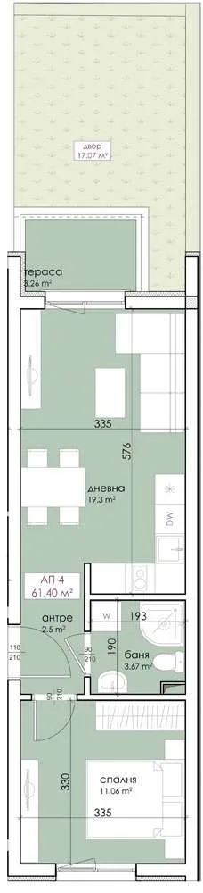 Предлаганият от нас имот е ситуиран на 1ви етаж с обща площ от 61,40кв.м. разгърната в следното разпределение: коридор, всекидневна с кухненски бокс, спалня, баня с тоалетна, тераса, двор 17,07 кв.м.