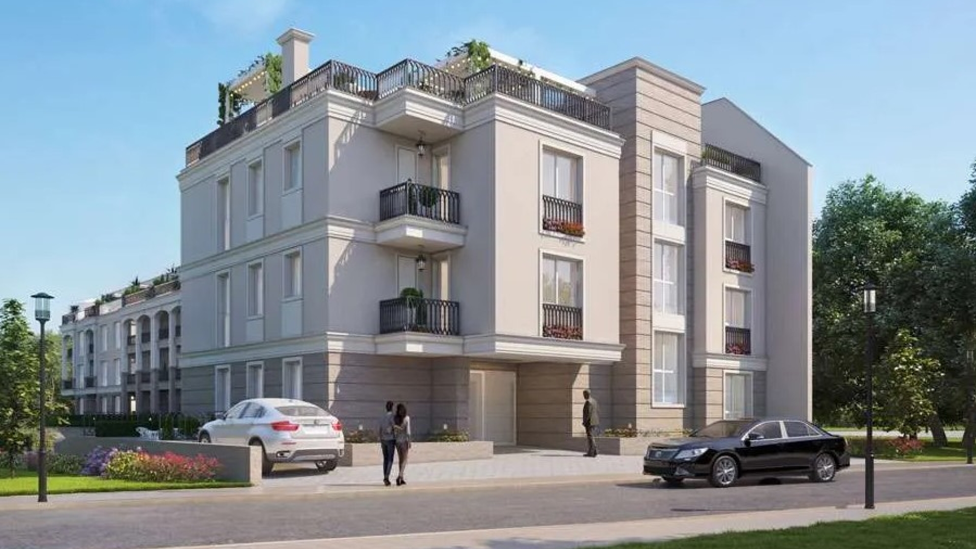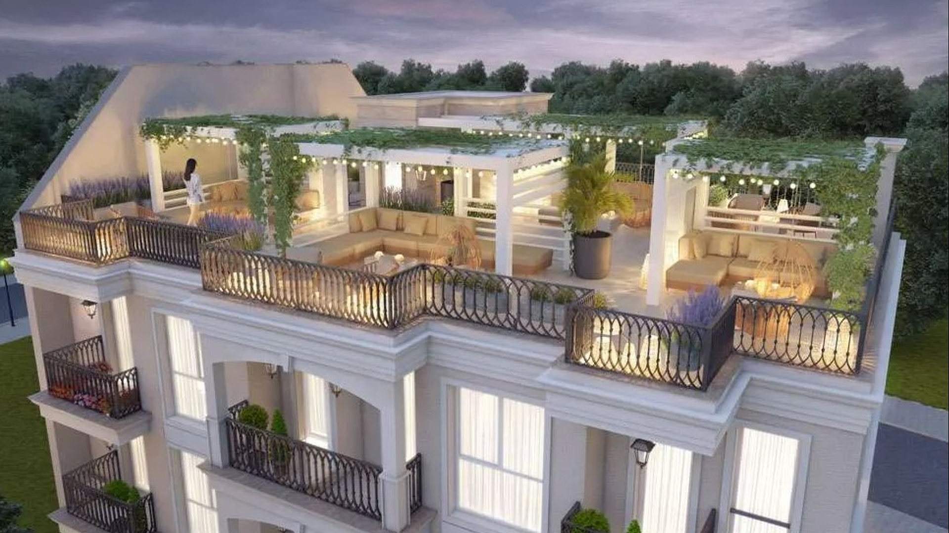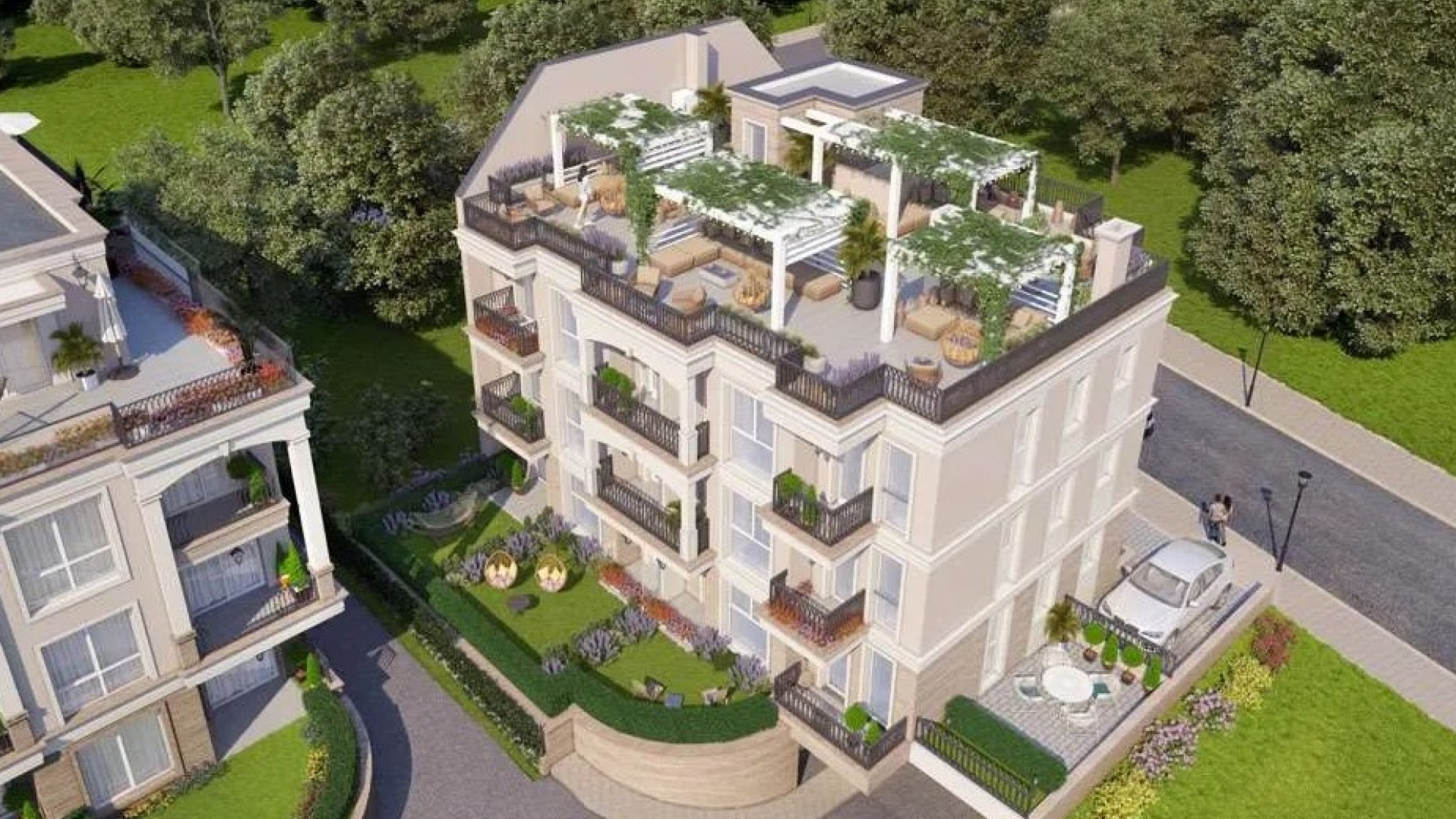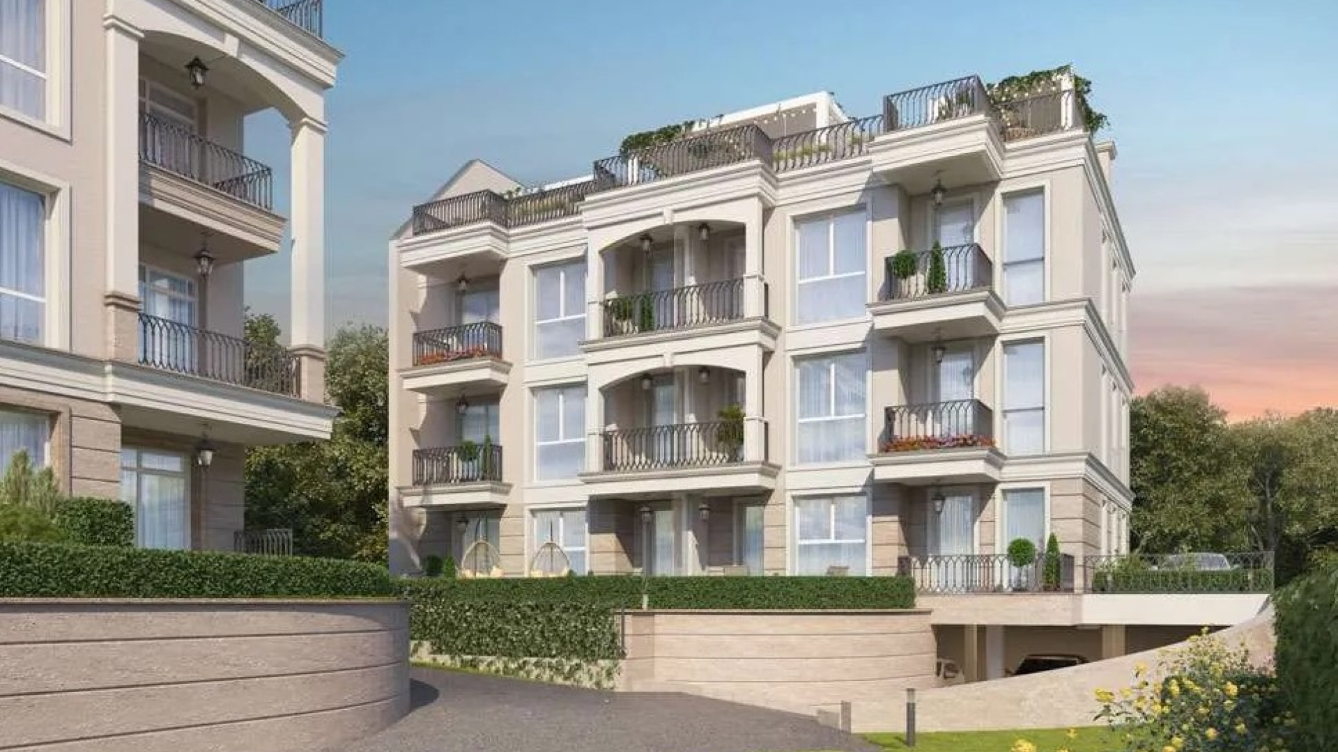 Сградата е на три жилищни етажа с подземен гараж, с асансьор, с частни дворове към апартаментите на първия етаж и просторни покривни тераси към апартаментите на третия етаж.