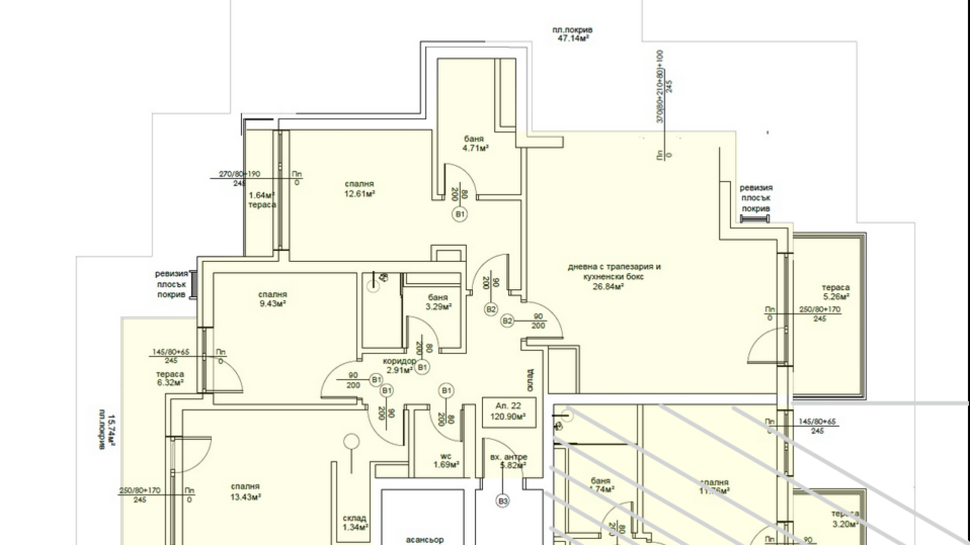 Апартаментът е разположен на втори жилищен етаж от шест етажа и разполага с площ от 137 кв.м. , от които 128 кв.м. - застроена площ. Разпределението както следва е : коридор, дневна с трапезария и кухненски бокс, три спални,две бани с тоалетни,три тераси. Изложението е запад/изток. Отоплението е на  ТЕЦ. Сградата е на етап АКТ 14 и ще бъде завършена края на 2027г. Жилището се предлага на шпакловка и замазка, предоставяйки възможност за персонализация на интериора. Предоставя идеалната възможност за новите собственици да създадат своя уютен и стилен дом в един от най-желаните райони на градa. В сградата предлагаме няколко апартамента с различна квадратура ,етаж и цена.