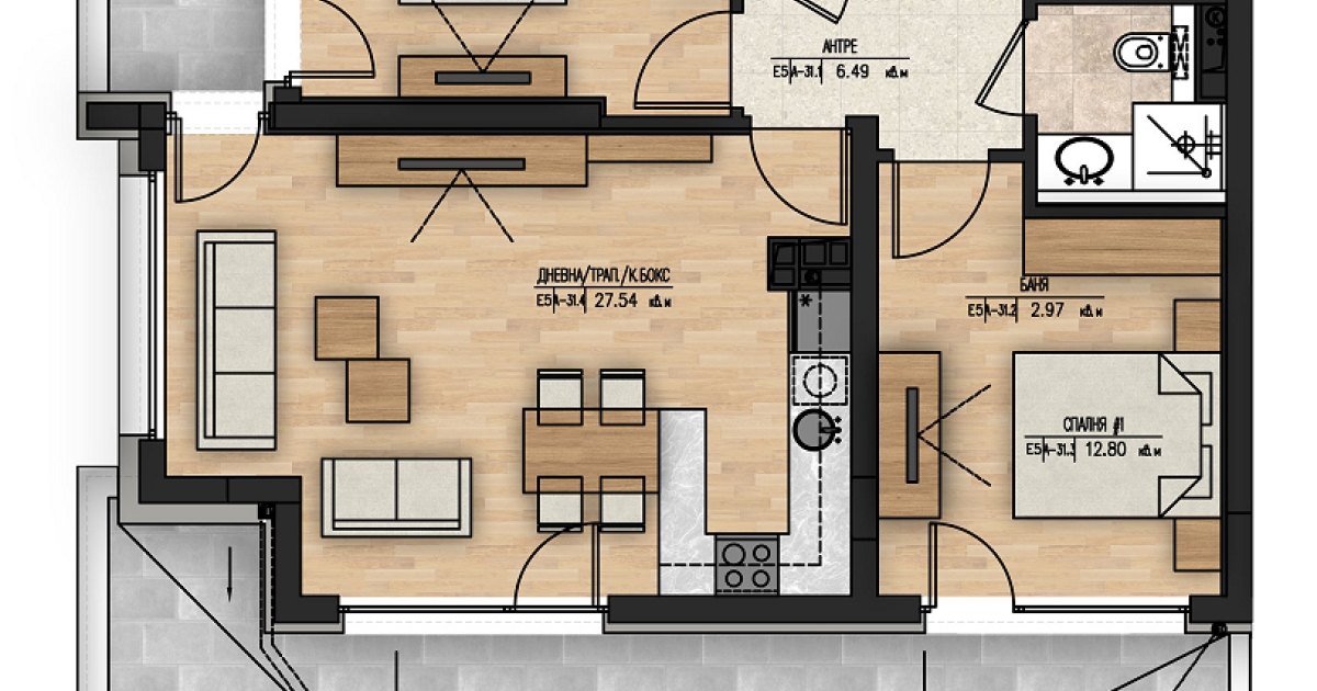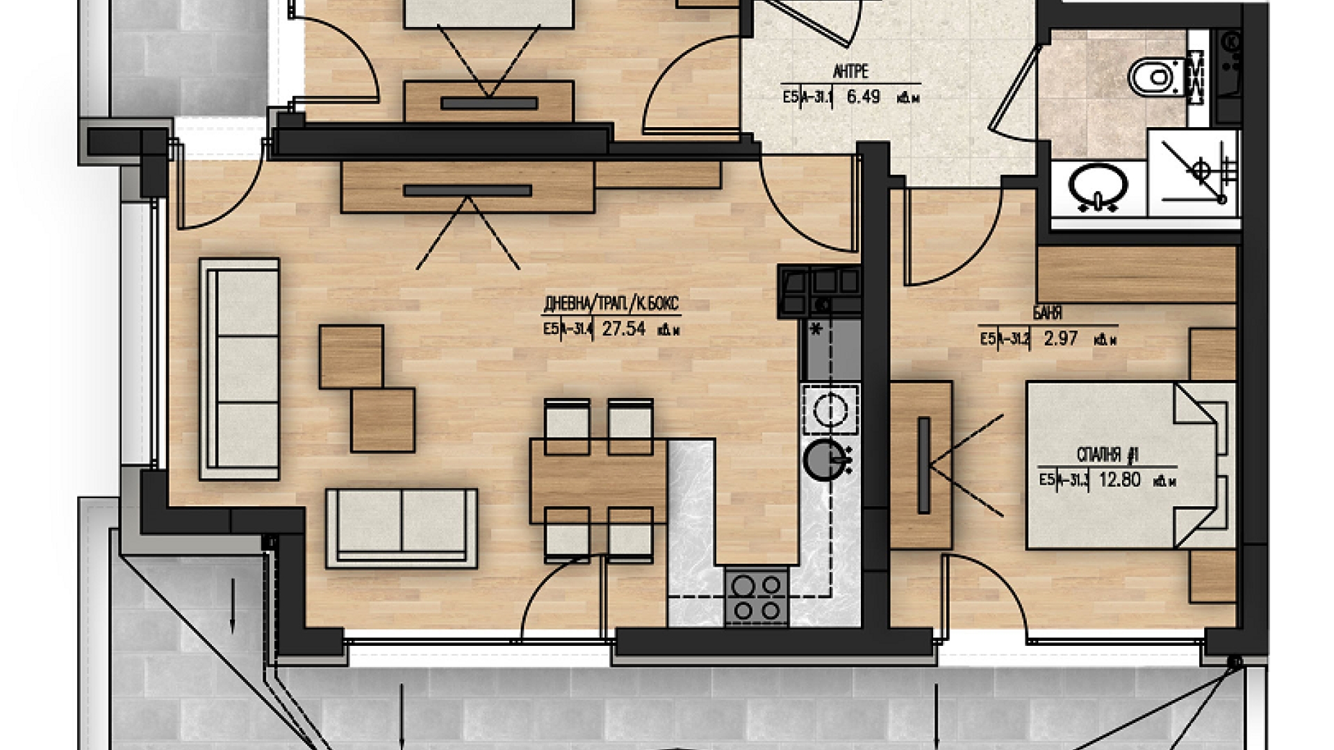Апартамент А-31 е ситуиран на 4-ти жилищен етаж и разполага със застроена площ от 111,06 кв.м., разгърната по следния практичен начин: антре, дневна с трапезария и кухненски бокс, 2 спалня, баня с тоалетна, отделна тоалетна, 2 тераси. Изложение: запад/юг. Жилището се предлага на шпакловка и замазка, за да може Вашето въображение да го превърне в мечтания за Вас нов ДОМ!