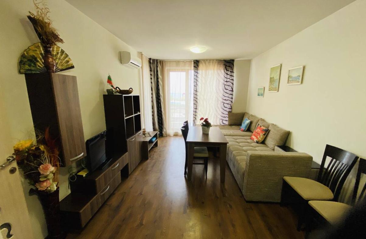 Имотът е ситуиран на 1-ви жилищен етаж и разполага с площ 69 кв.м. разгърната в следното разпределение: спалня с едно двойно легло с допълнителен разтегателен диван, хол с телевизор и разтегателен диван, кухня оборудвана с всичко необходимо фурна, микровълнова, кана за топла вода, кафе машина и посуда. Просторна тераса с гледка към морето и басейна.