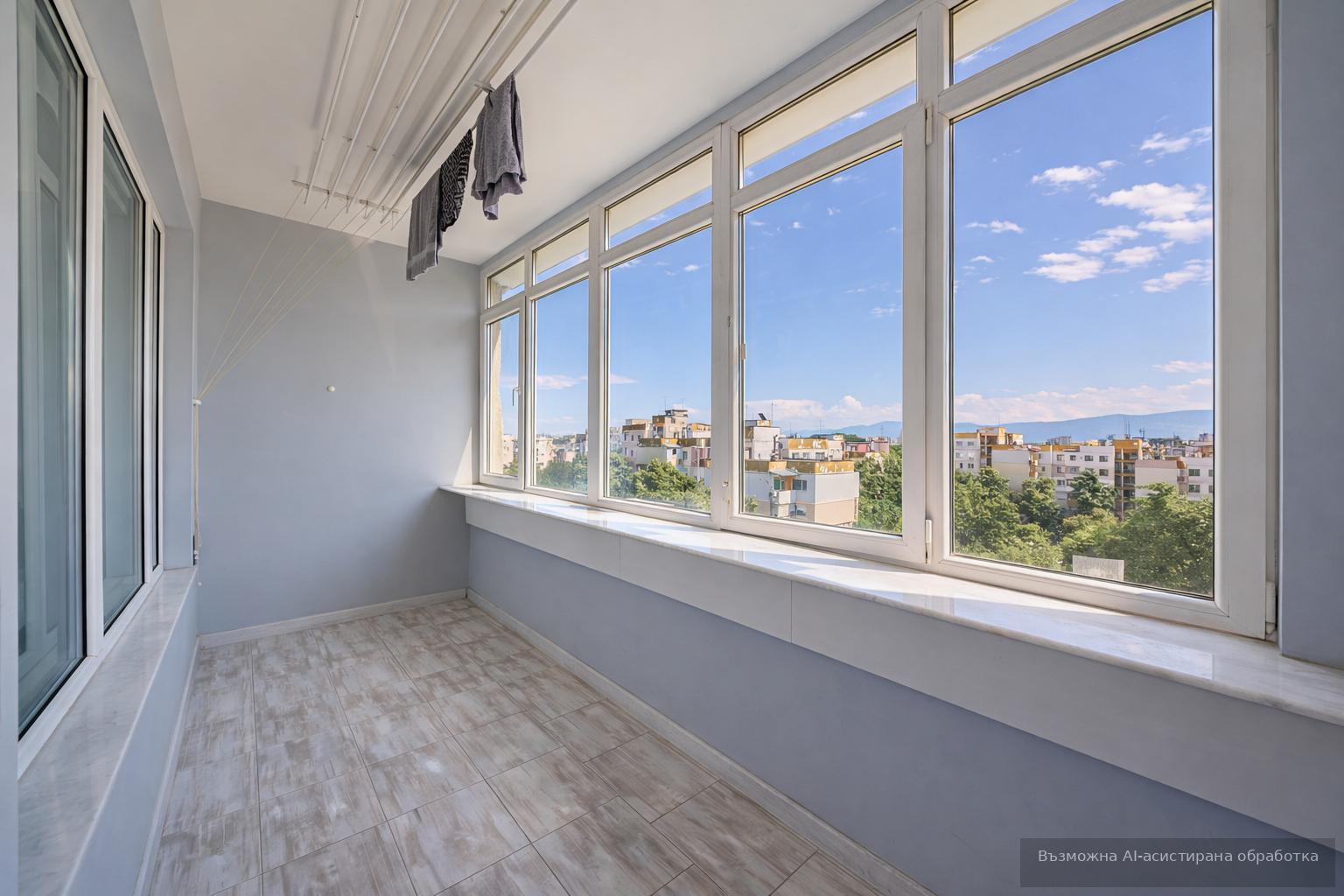 Имотът от своя страна е ситуиран на 7-ми жилищен етаж и разполага с площ 55кв.м, разгърната в следното разпределение: входно антре, хол с кухненски бокс, спалня, баня с тоалетна и закрита тераса.
