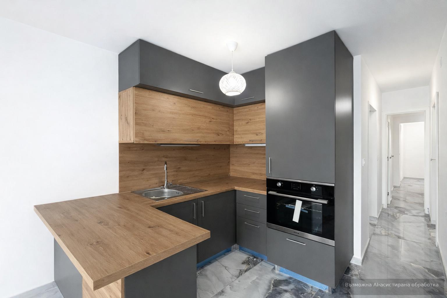 Хол с кухненски бокс, отделна спалня, две тераси и баня с тоалетна. Апартаментът е изцяло обзаведен и отопляван чрез ТЕЦ.