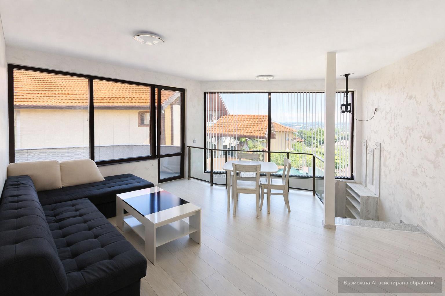 Имотът разполага с площ 85кв.м, разгърната в следното разпределение: самостоятелно стълбище, дневна с кухненски бокс, две просторни спални, баня с тоалетна и тераса.