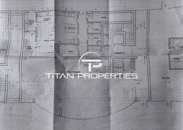 - зала за хранене с мокър бюфет,келнерски офис,миялно помещение, помещение топла и студена кухня,4 склада,гардеробно,