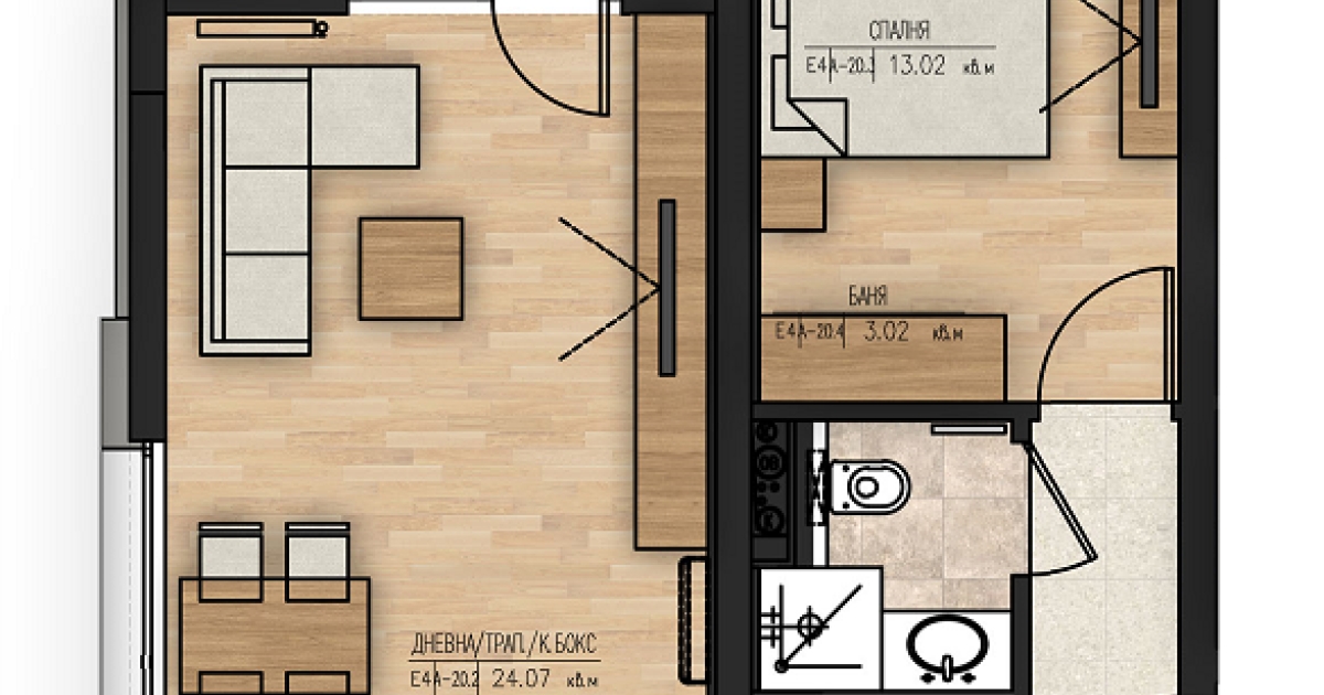 Апартамент А-20 е ситуиран на 3-ви жилищен етаж и разполага със застроена площ от 61,99 кв.м., разгърната по следния практичен начин: антре, дневна с трапезария и кухненски бокс, спалня, баня с тоалетна, тераса. Изложение: запад. Жилището се предлага на шпакловка и замазка, за да може Вашето въображение да го превърне в мечтания за Вас нов ДОМ!