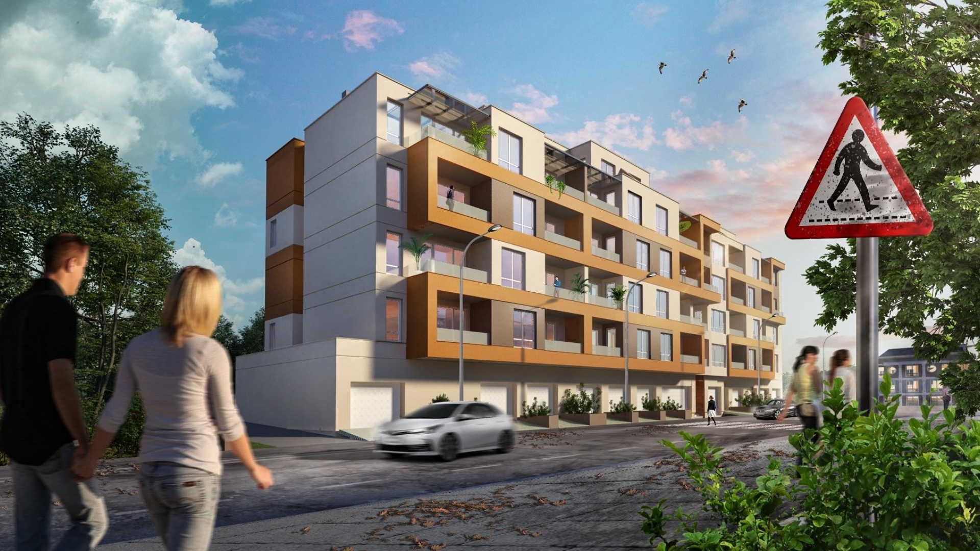 Сградата се състои от партерен етаж с гаражи, паркоместа и шест жилищни етажи с двустайни и тристайни апартаменти.