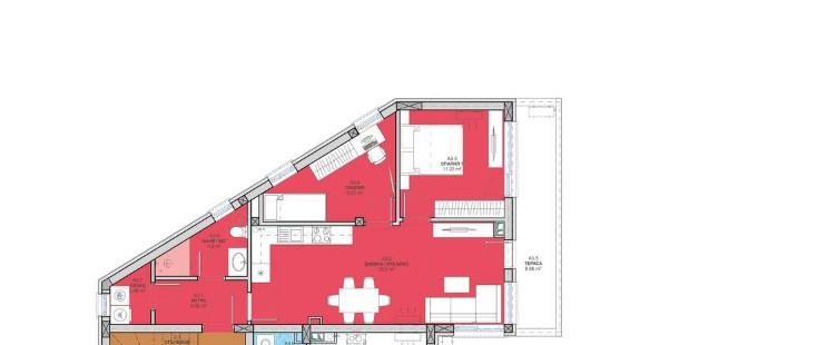 Жилището с площ 98 кв.м е разположено на 3-ти етаж и има следното разпределение: хол с кухненски кът, 2 спални, баня с тоалетна и тераса.