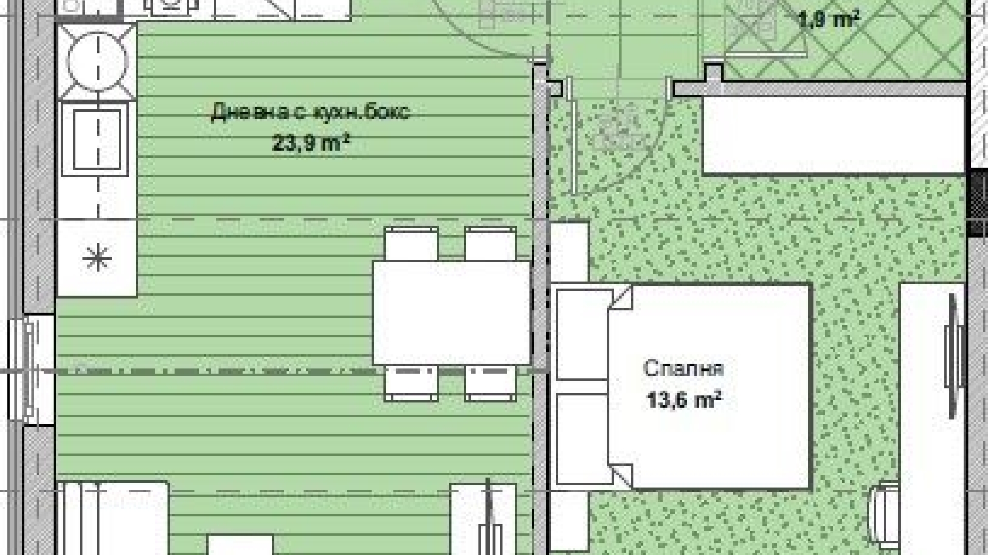 Имотът разполага с площ от 86 кв.м., разпределена по следния начин: Входно антре, дневна с кухненски бокс, спаля, баня и тоалетна, отделна тоалетна, тераса и склад.