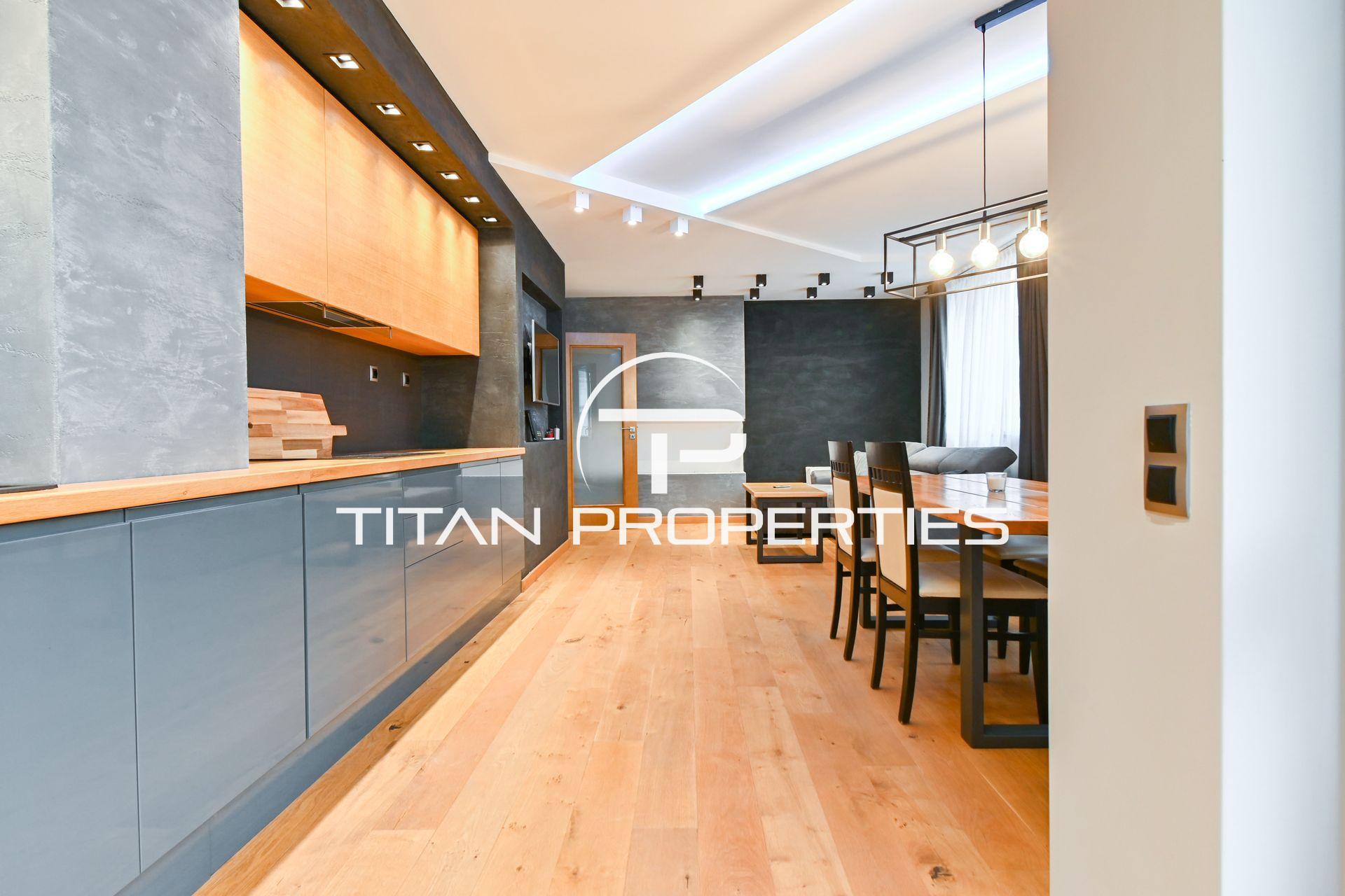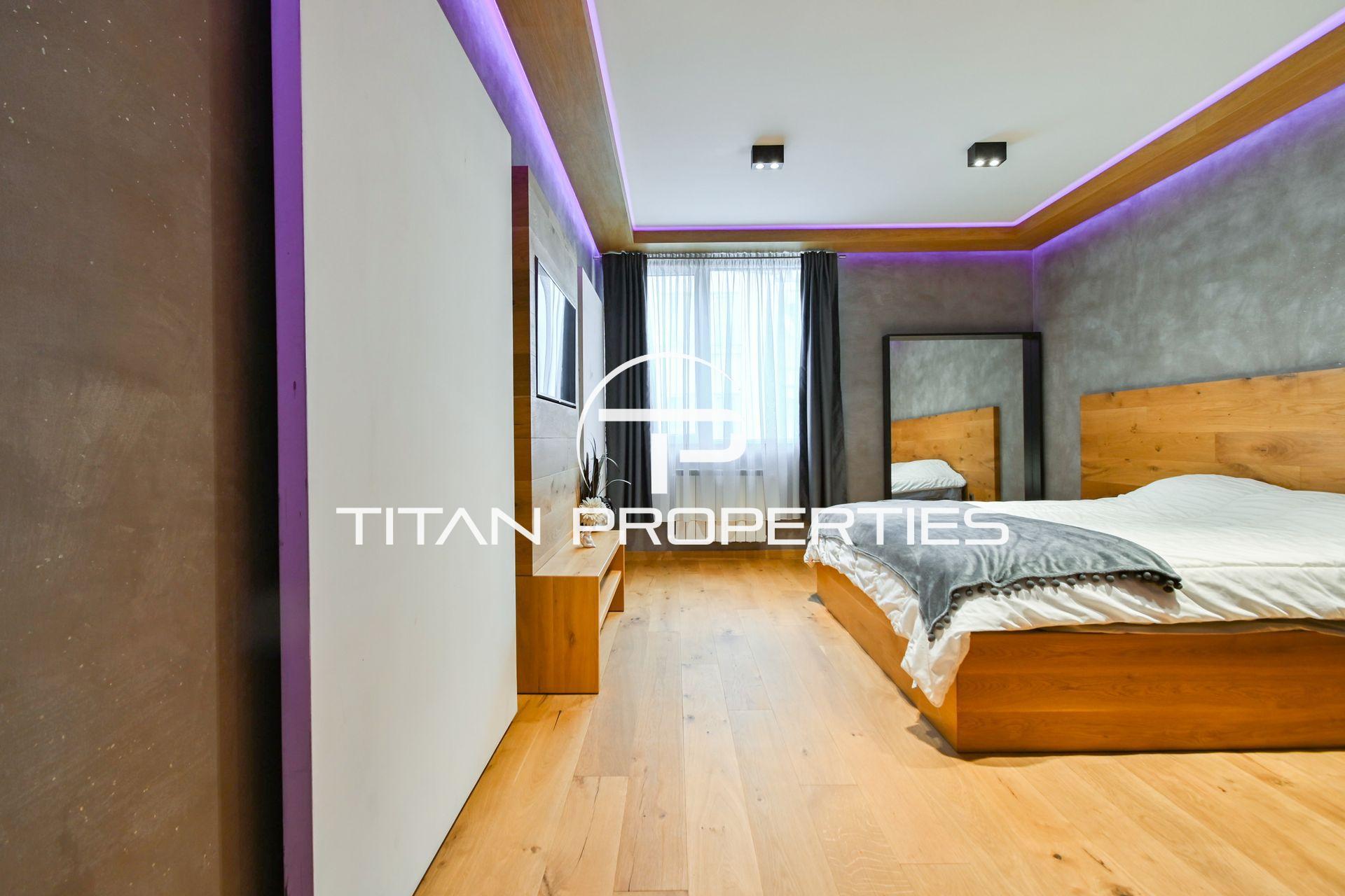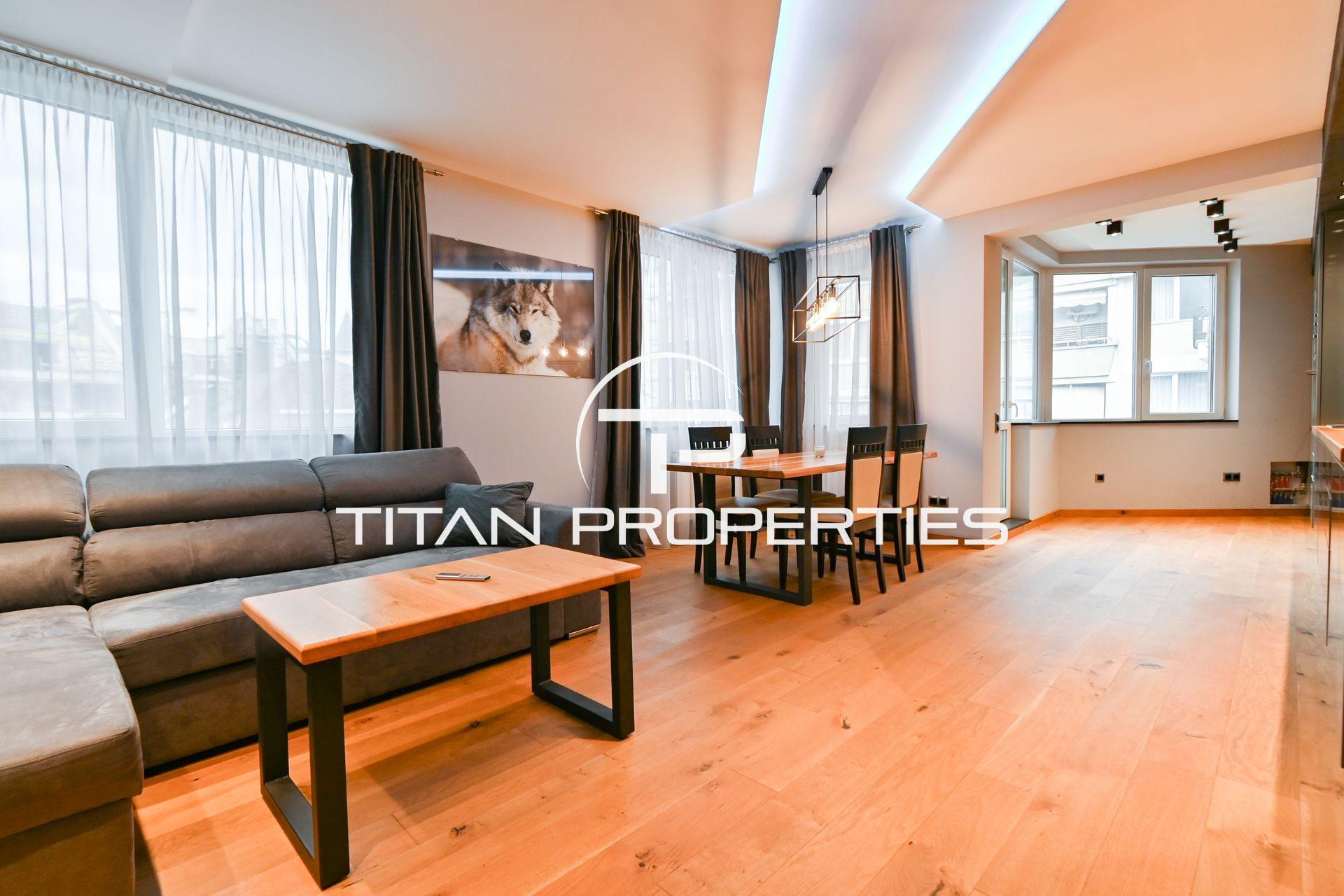 Апартаментът е с изцяло ново и не използвано обзавеждане, което съчетава стил и качество – плотът, масите и всички дървени елементи са от естествен дъб, както иподовите настилки. Осветлението е модерно LED с възможност за промяна на цветовете, създаващо уютна атмосфера. Жилището разполага с газово отопление чрез газово котле.