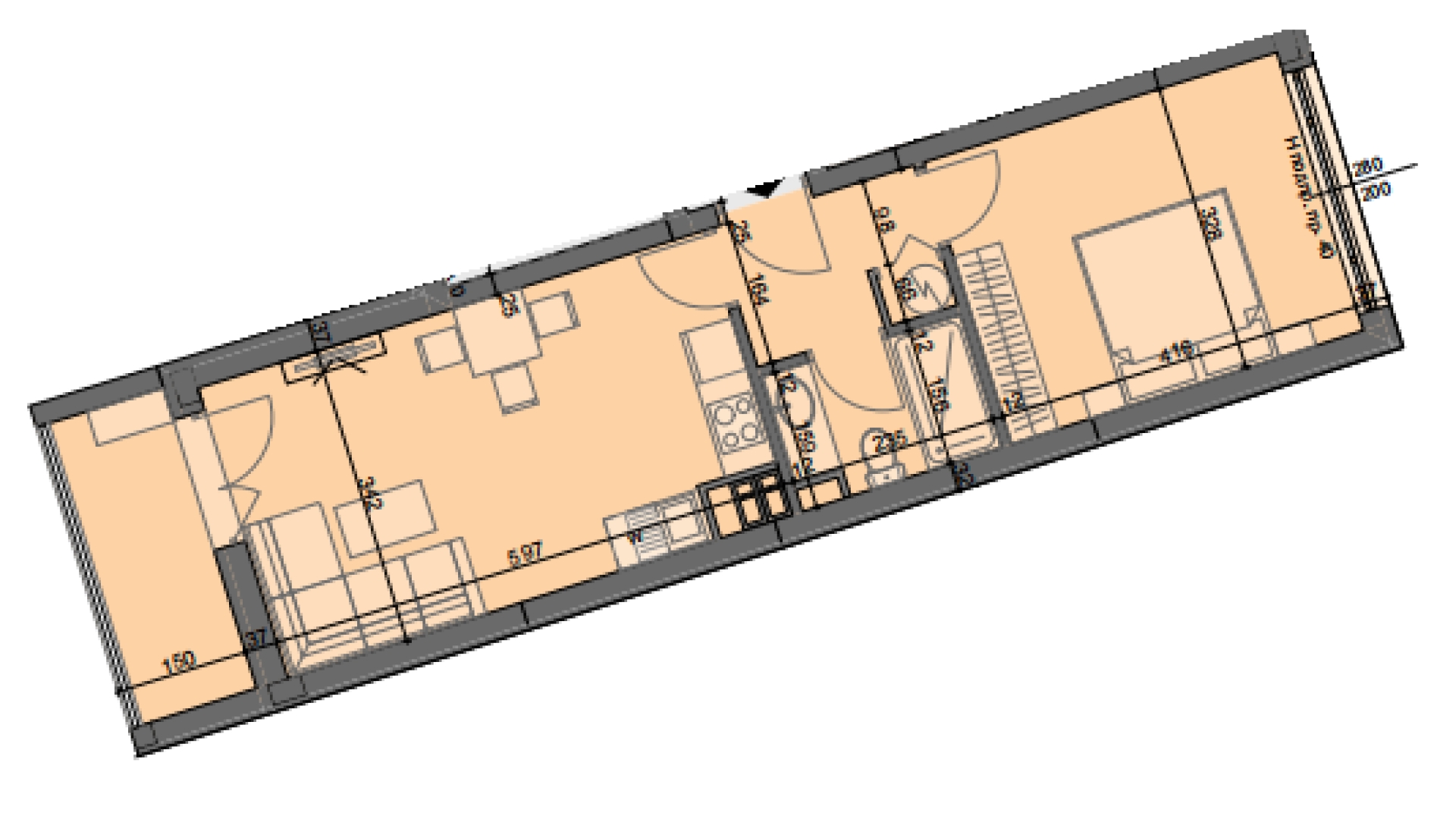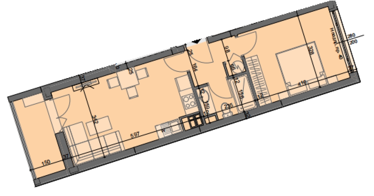 Апартамент А25 е ситуиран на 6-ти жилищен етаж и разполага със застроена площ от 54,85 кв.м., разгърната по следния практичен начин: антре, дневна с трапезария и кухненски бокс, спалня, баня с тоалетна, тераса. Изложение: север/юг.
