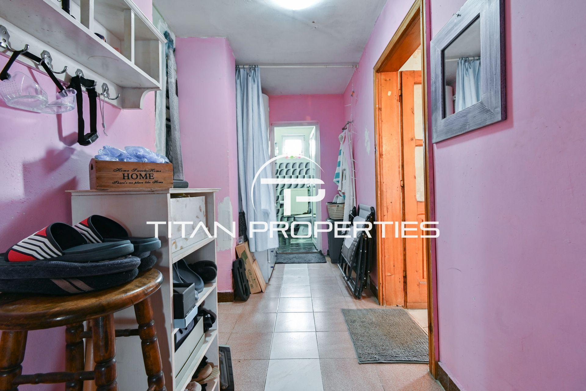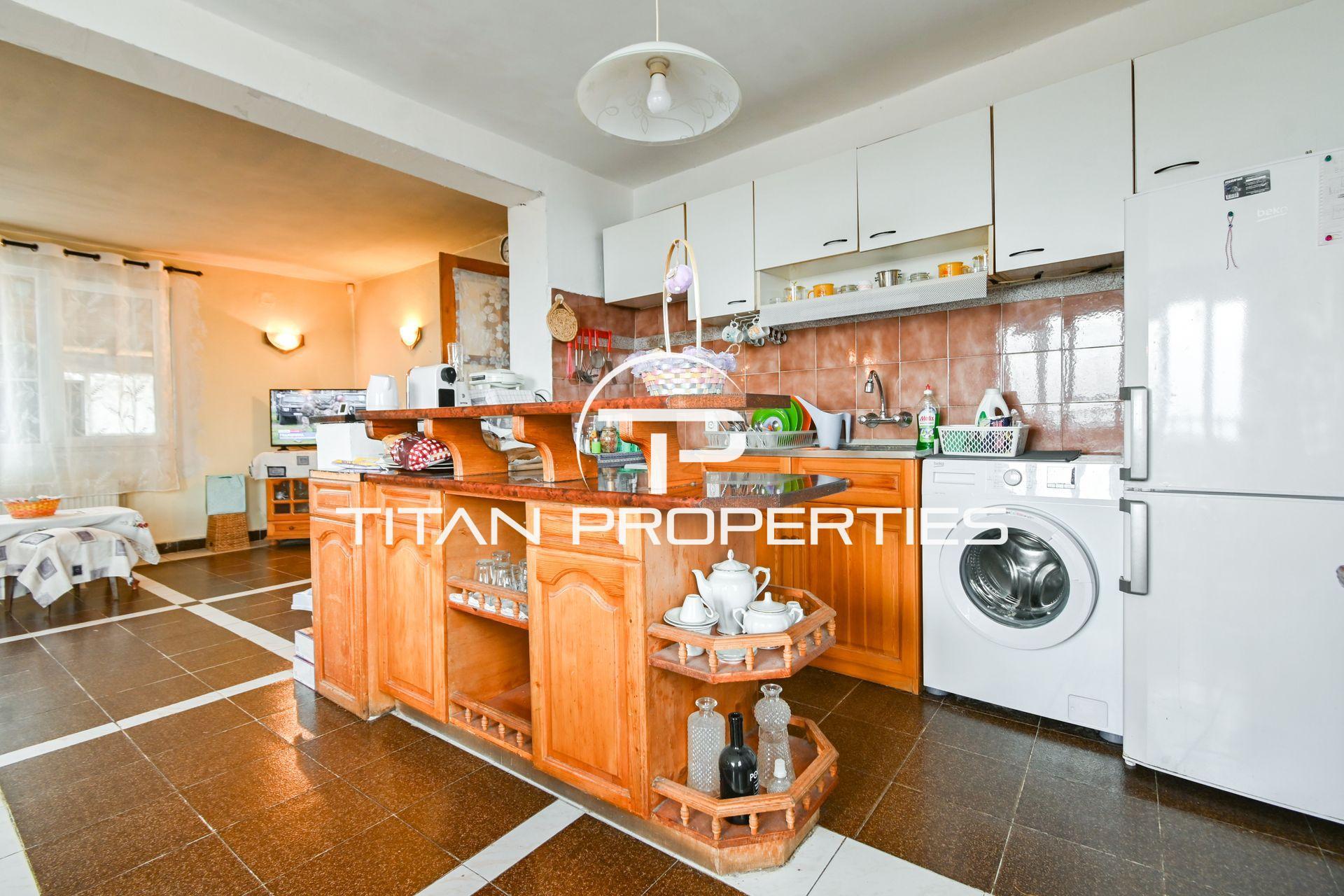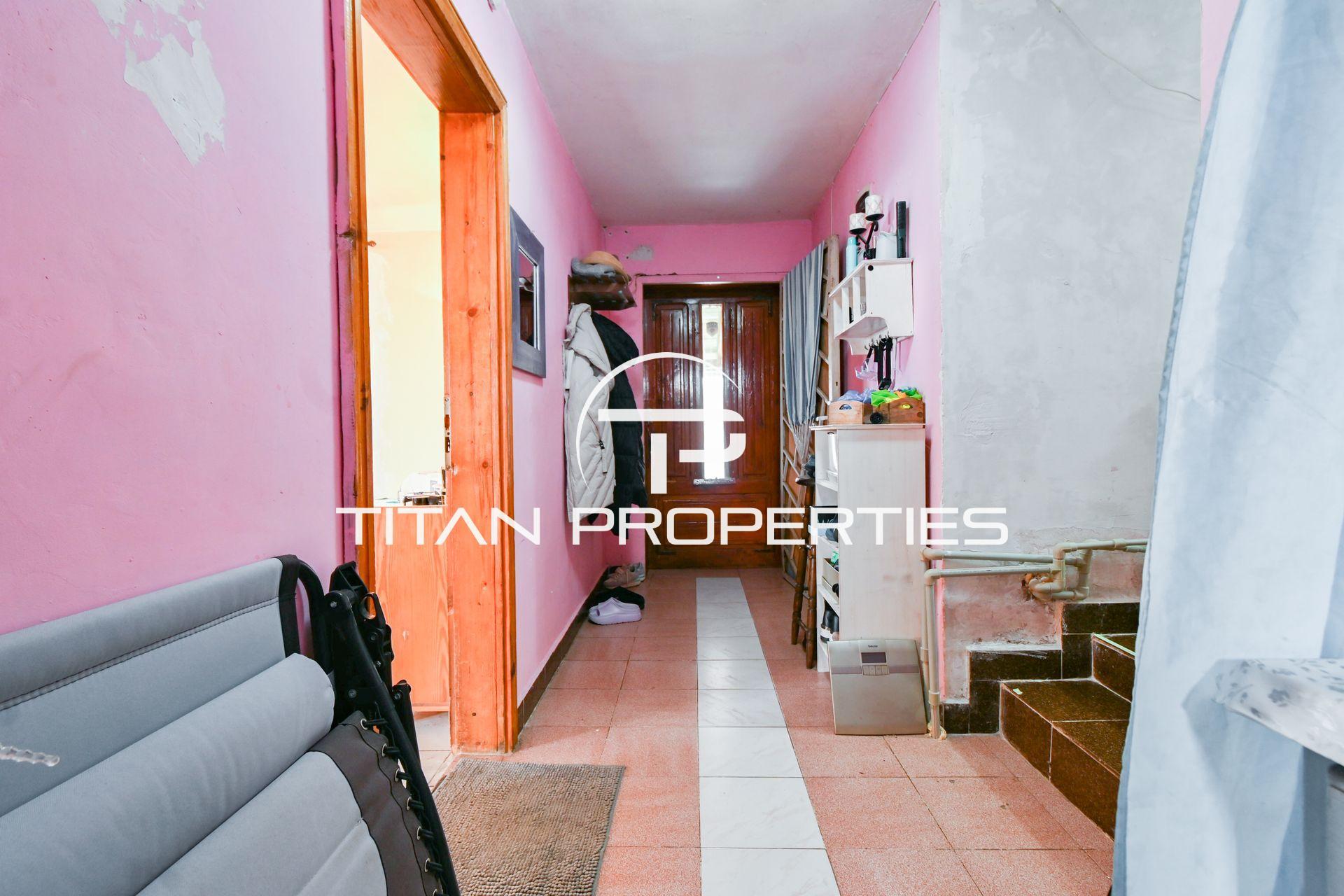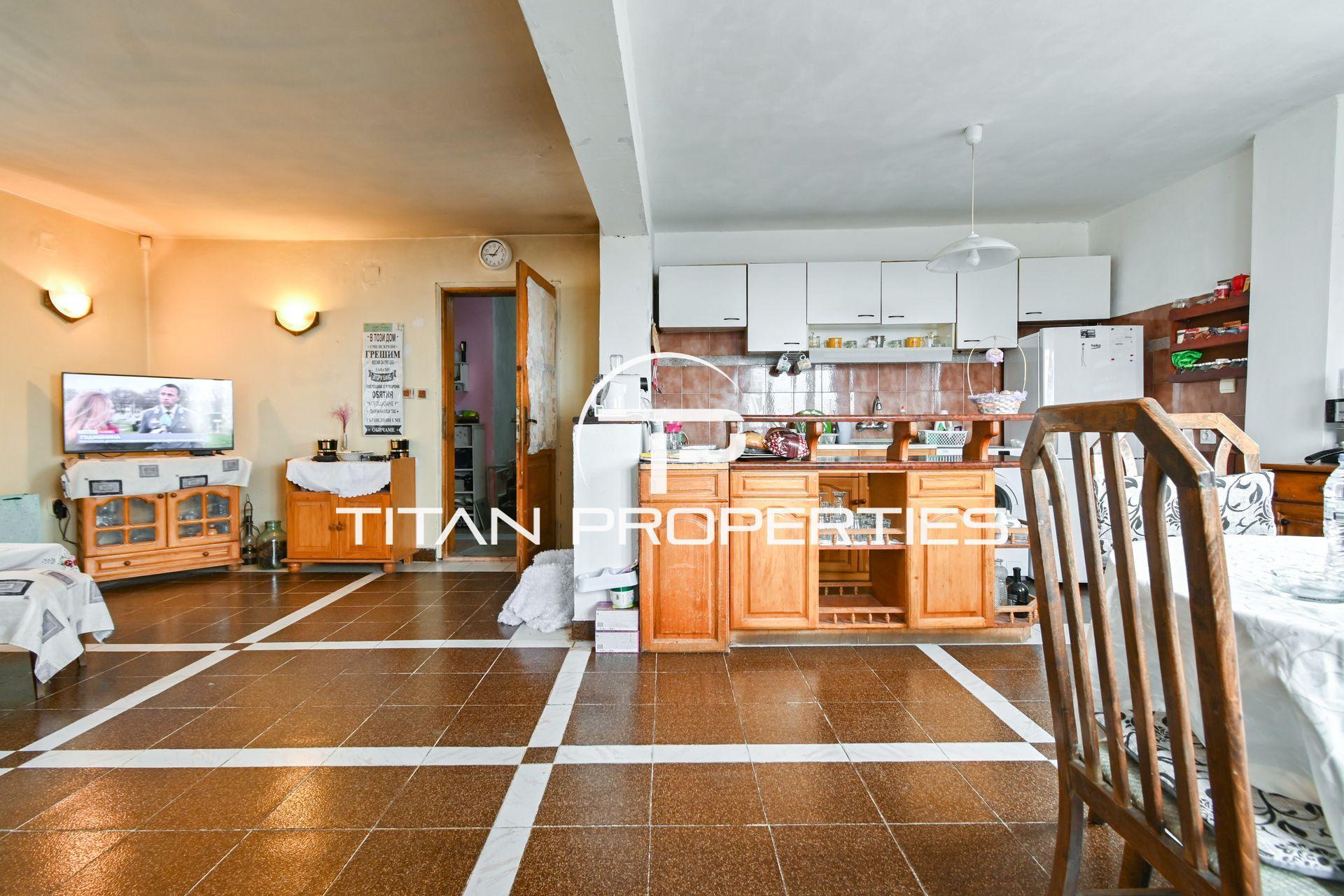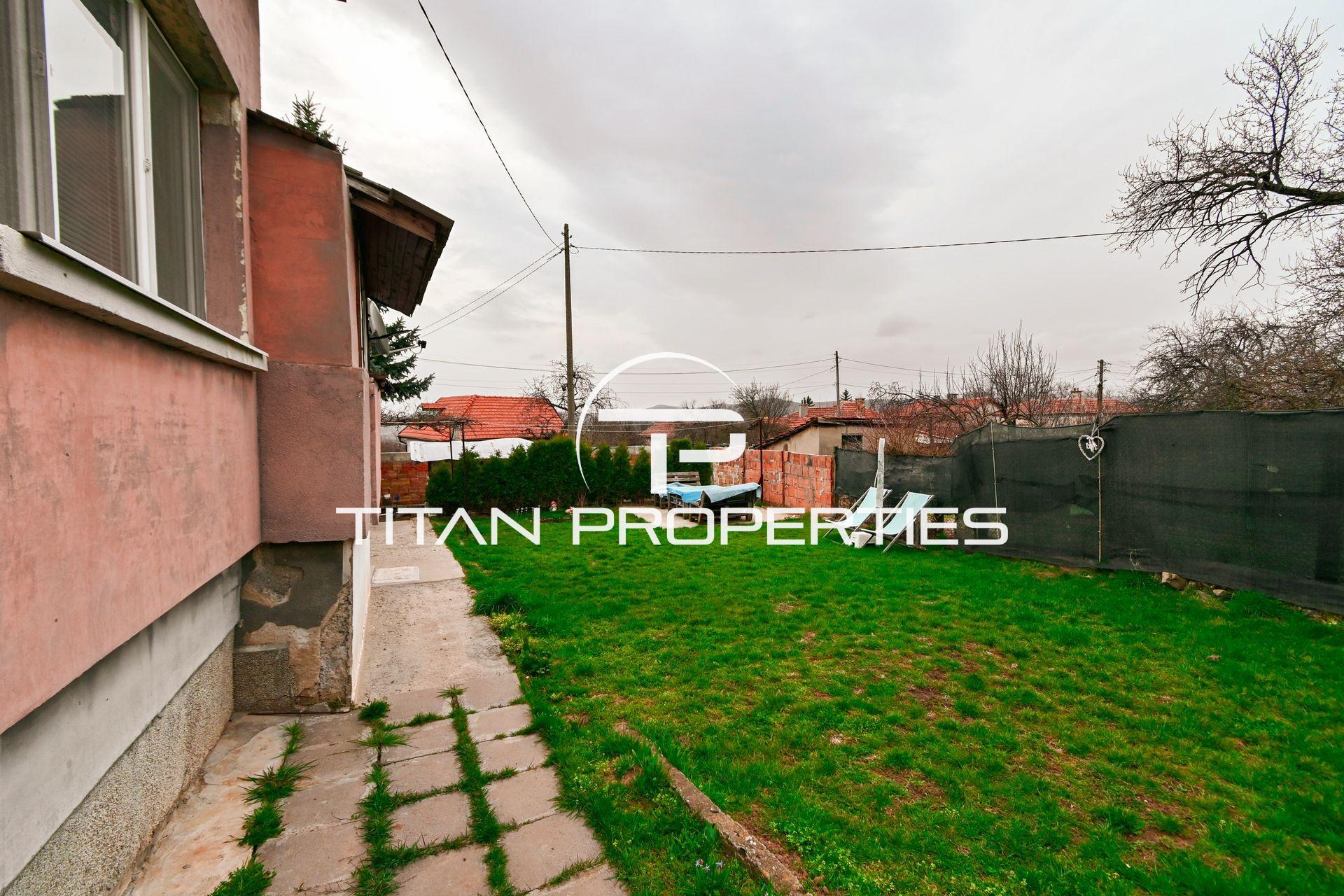 Титан Пропъртис офис - Бул. България с радост предлага на Вашето внимание двуетажна къща за продажба в с. Храбърско, област София. Със застроена площ 100 кв.м. е изградена от тухла преди 2000 г. и предлага източно, западно, северно и южно изложение. На първия етаж ви посреща входно антре, просторна всекидневна с кухненски бокс, баня с тоалетна и детска спалня. Родителската спалня и детската стая споделят обща тераса. Къщата разполага с двоен гараж и допълнително помещение за механа. В двора е обособена зона за барбекю и стара малка каменна къща с две помещения в подпокривното пространство за воден резервоар. Имотът се предлага обзаведен, а отоплението е с котле на дърва, има и климатик.