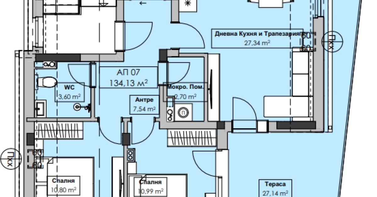 Предлаганият от нас апартамент е ситуиран САМОСТОЯТЕЛНО на 4-ти жилищен етаж и разполага с площ от 150,53 кв.м разгърнати в следното практично разпределение: хол с кухня и трапезария, 2 спални, баня с тоалетна, мокро помещение и тераса.