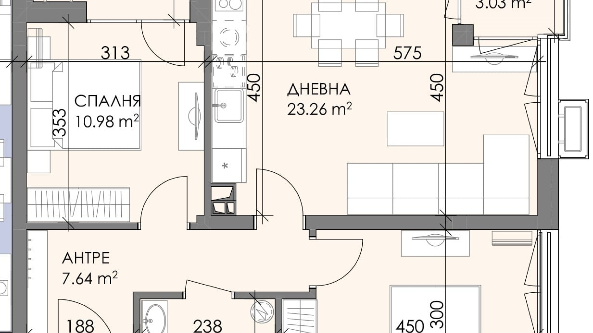 Имотът е ситуиран на 5ти жилищен етаж с обща площ от 95.21 кв.м. разгърната в следното разпределение: коридор, хол с бокс кухня, две спални,  баня с тоалетна, две тераси.