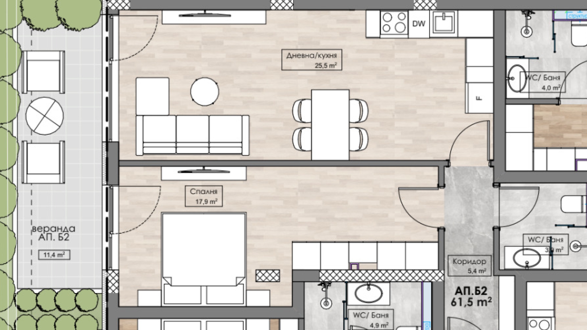 Апартамент Б2 е двустаен и се намира в сграда 1, ситуиран на 1-ри жилищен етаж (партер). Разполага с входно антре, дневна с кухненски бокс, спалня,баня с тоалетна и веранда. Квадратурата с общи части е е 80.89 кв. м. , а застроената площ е 61.5кв.м.
