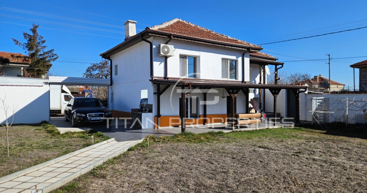 Имотът е след основен ремонт и предлага комфортно разпределение, включващо: Първи етаж: кухня, дневна, баня с тоалетна и коридор. Втори етаж: две спални, коридор и помещение, подготвено за баня с тоалетна. В двора ще откриете уютна беседка с барбекю, както и система за автоматично напояване. Има и площ от 43 м², подходяща за изграждане на стопанска постройка.