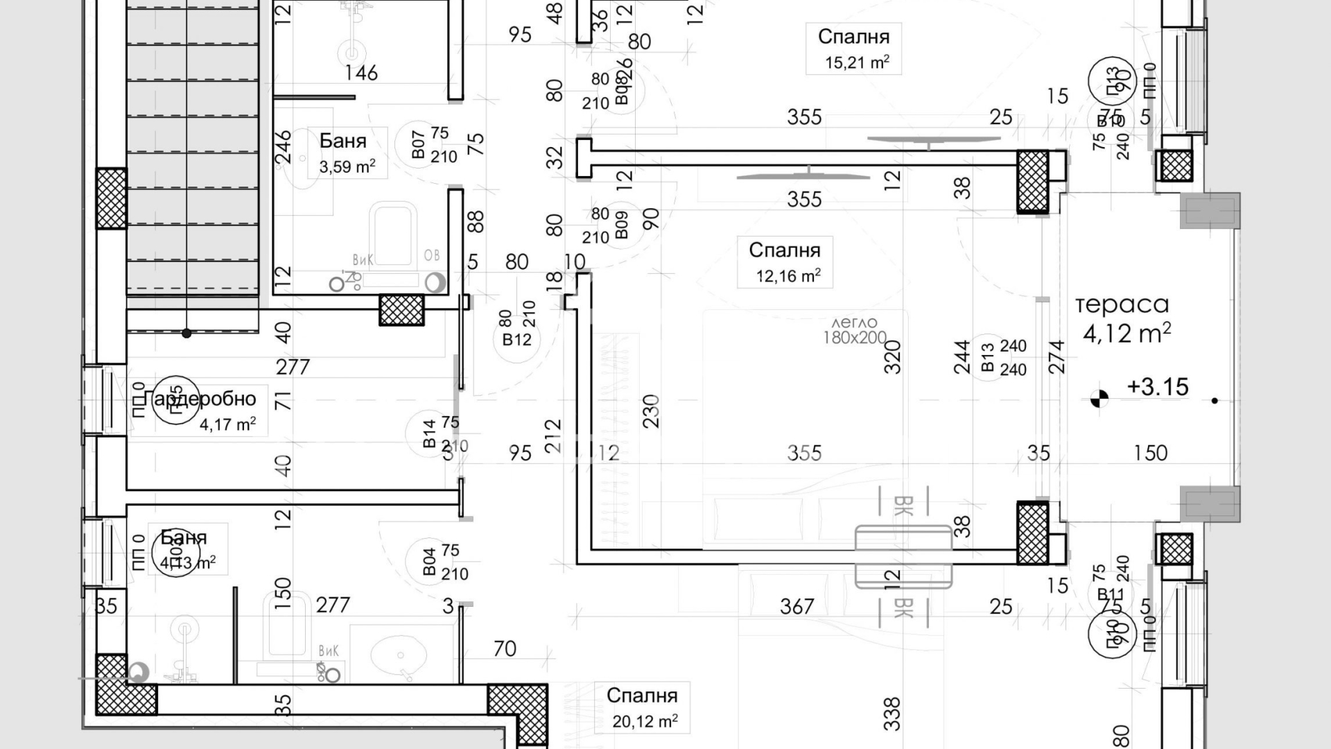 Имотът разполага с площ от 165 кв.м. , като разпределението включва: Входно антре, дневна с кухня и трапезария, баня с тоалетна и веранда; на втори етаж има коридор, три спални, две бани с тоалетна, гардеробно и перално помещение с тераса.