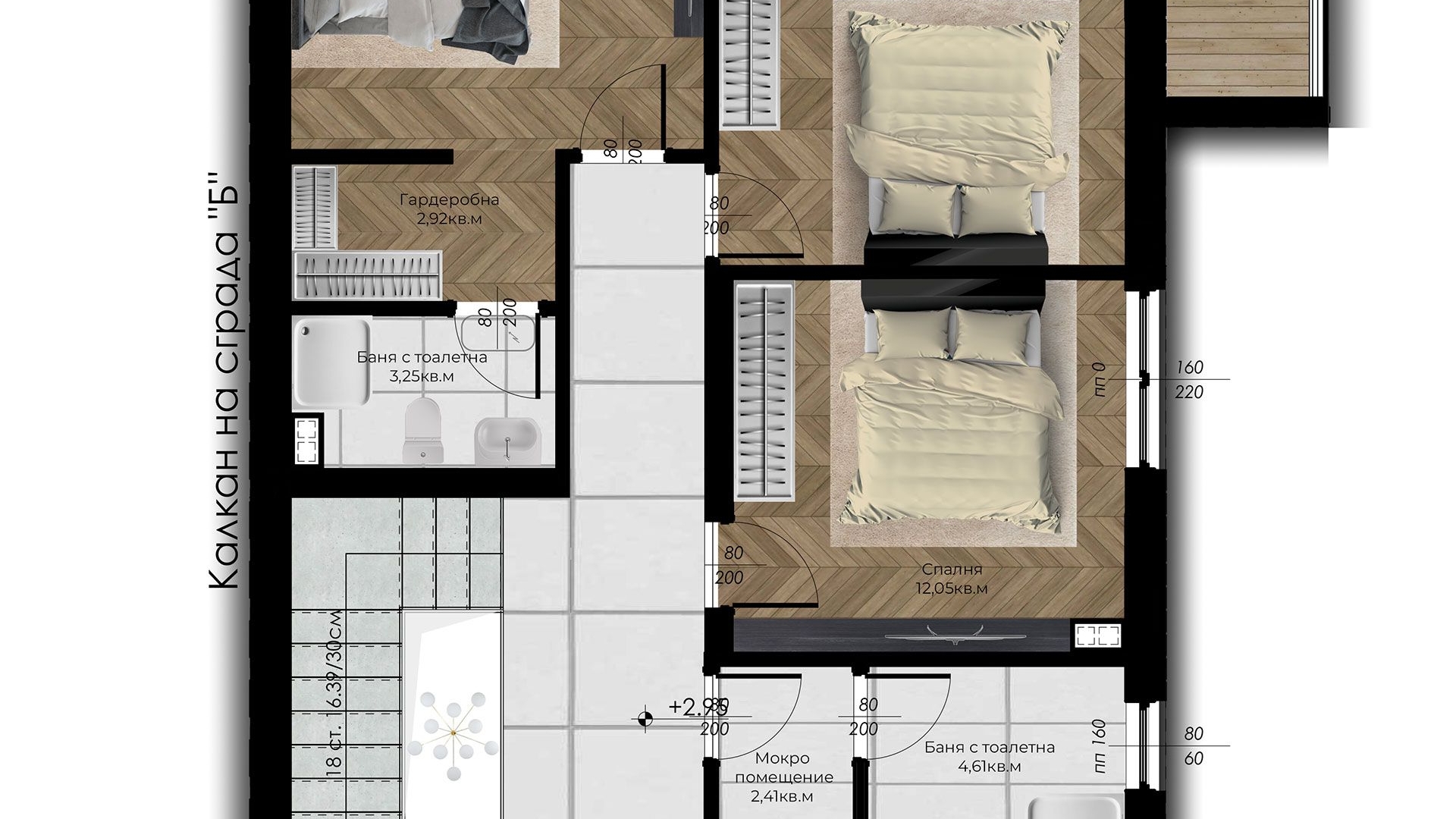 Ниво 2 впечатлява със своите три спални, гардеробна, мокро помещение, две бани с тоалетни, както и две просторни тераси.