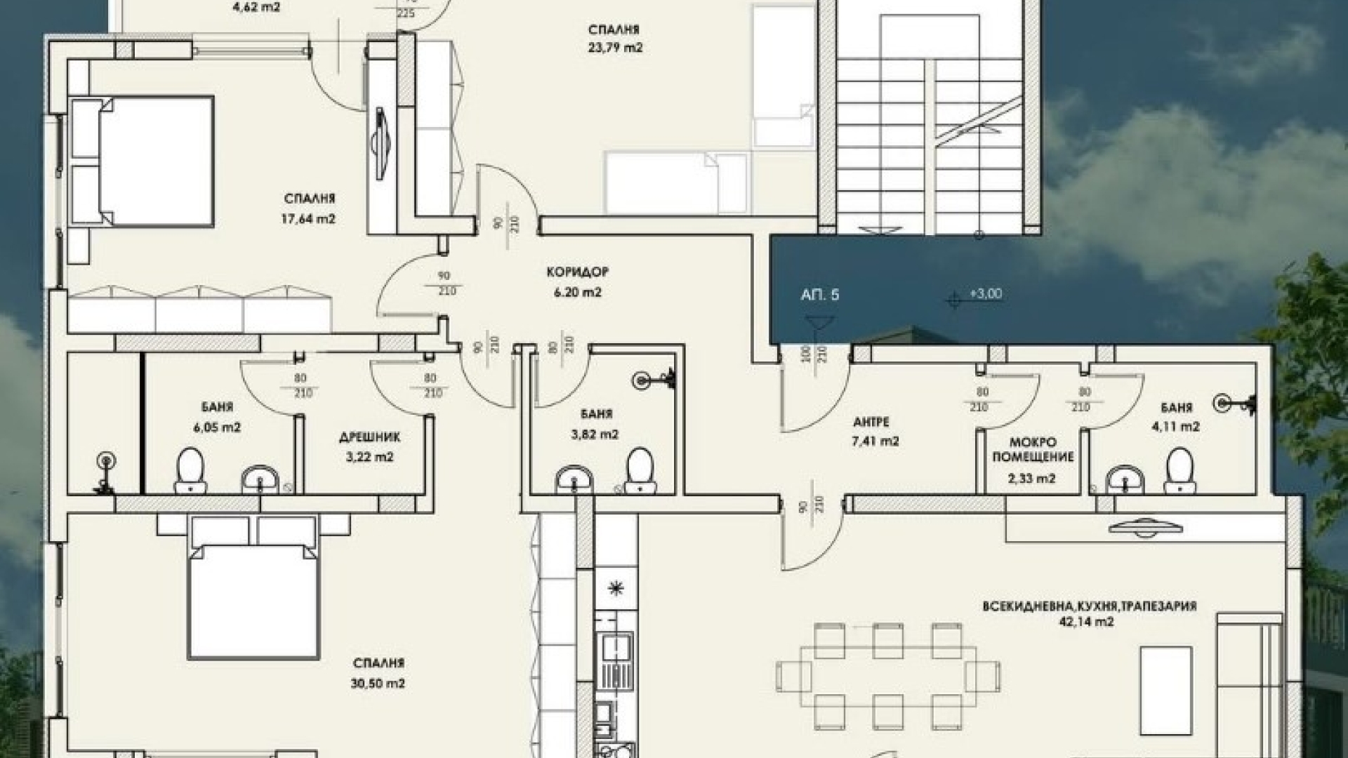 Имотът е ситуиран на 3-ти жилищен етаж и разполага с площ от 206 кв.м., разгърната в следното практично разпределение: Просторно антре и коридор, всекидневна с кухня и трапезария, три спални, дрешник, три бани с отделно мокро помещение, както и три тераси.