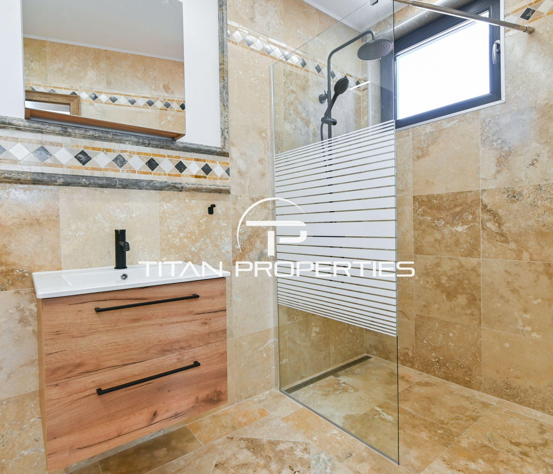 Новоизградена, с разгъната площ 300 кв.м., къщата е разположена на три нива с източно, западно, северно и южно изложение за естествена светлина. Първото ниво включва хол с кухненски кът, двор и тоалетна; второто – две спални със самостоятелни бани и тоалетни; третото – спалня с баня, тоалетна и мокро помещение.