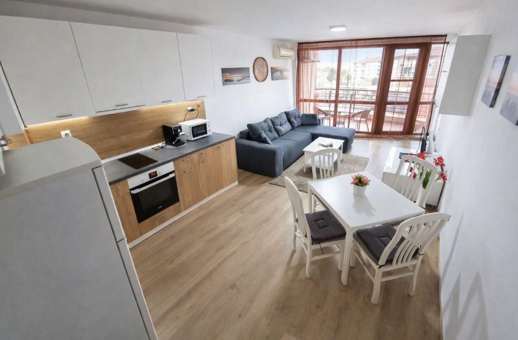 Имота е ситуиран на 2-ри етаж и разполага с площ от 65 кв.м разгърнати в следното практично разпределение: входно антре, хол с кухня, спалня, баня с тоалетна и тераса.